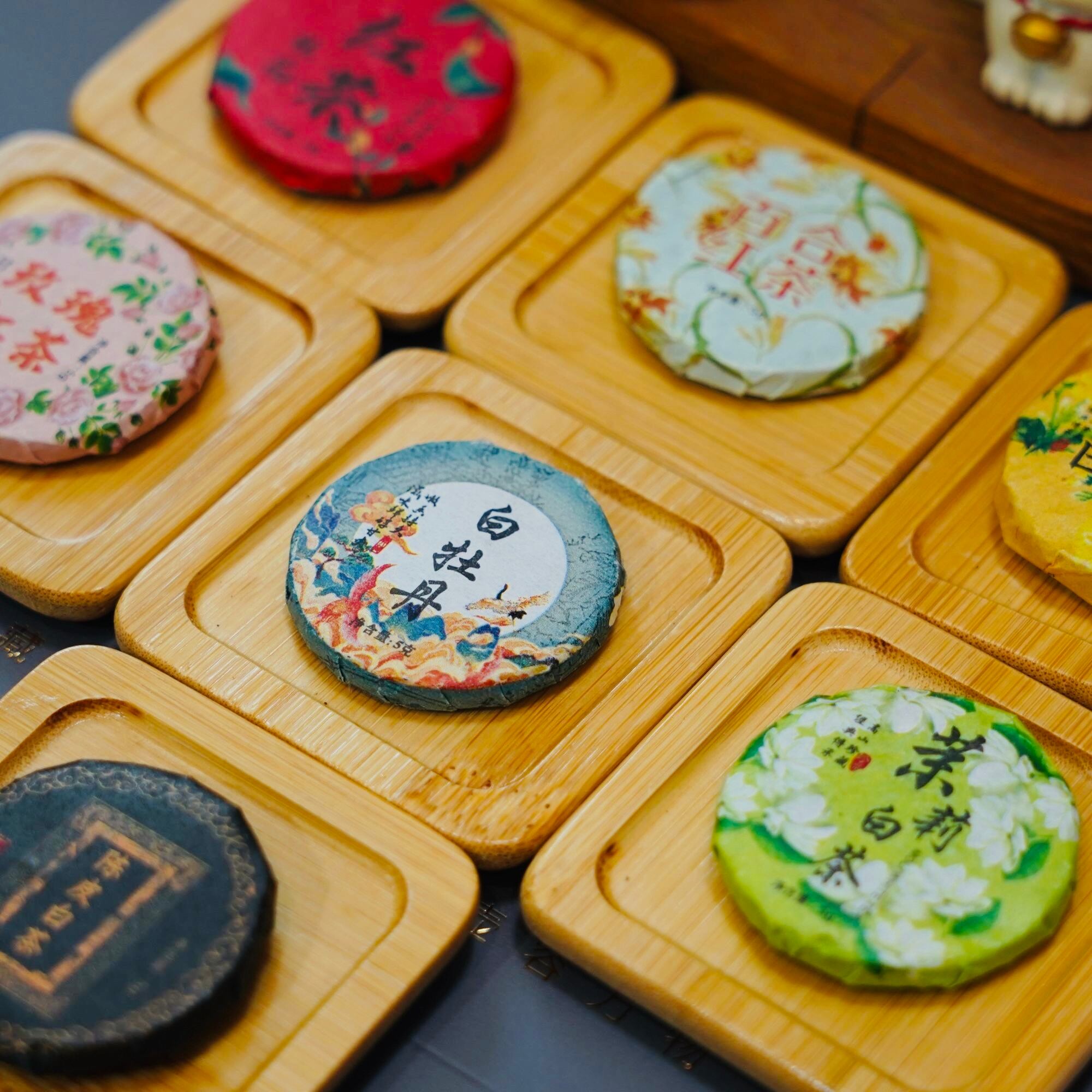 ①白茶組:茉莉白茶、桂花白茶、菊花白茶、薄荷白茶、陳皮老白茶、陳皮白茶、白茶寿眉、老白茶など