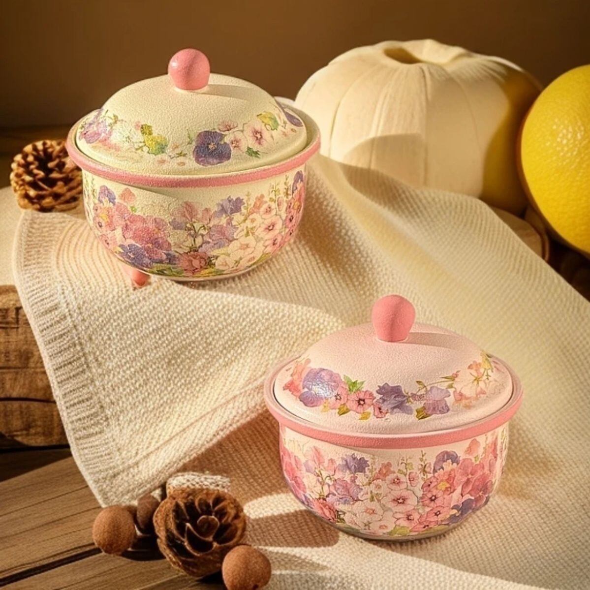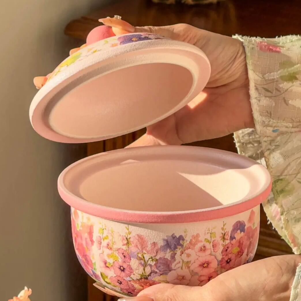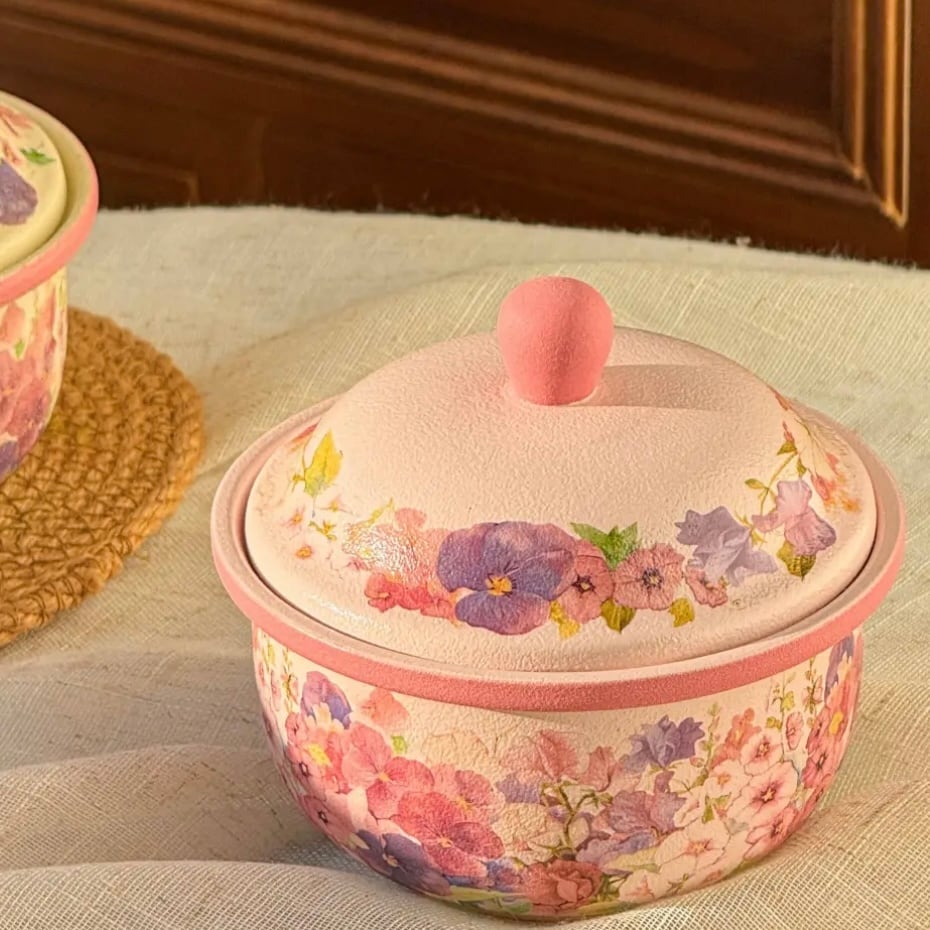 ◎蓋付き小鍋、茶碗蒸しやいろんな料理をに使え、美しい花が施され、派手やかな色合いが特徴です。
