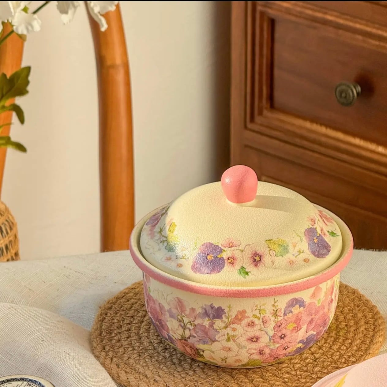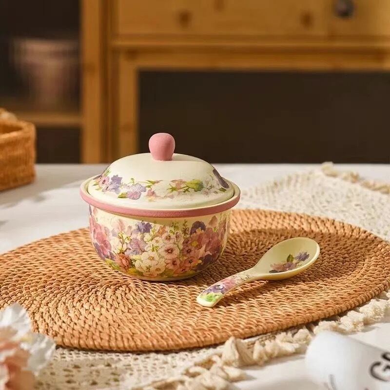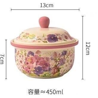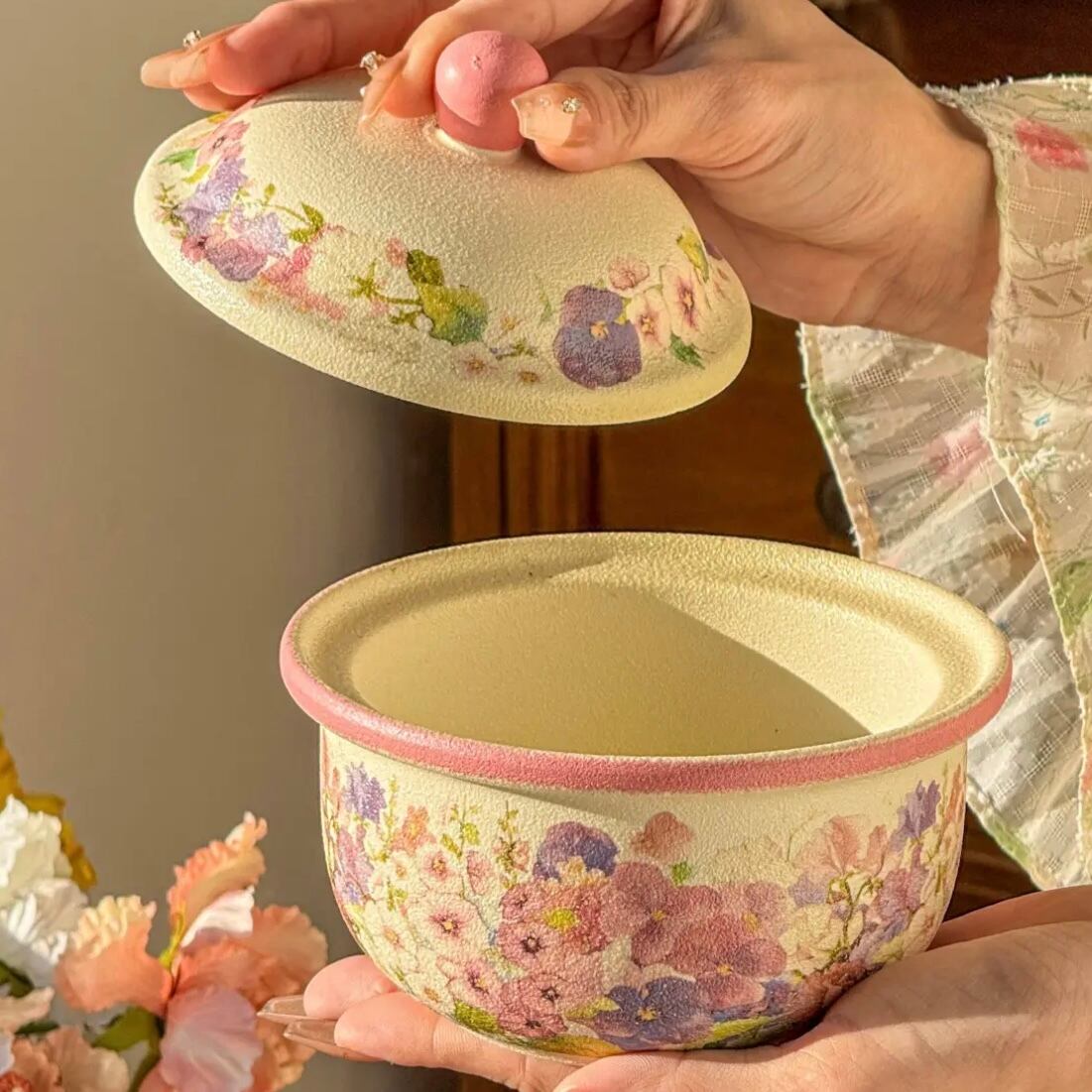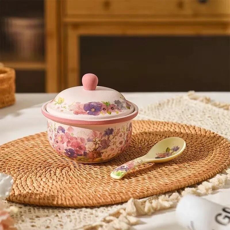 ◎蓋付き小鍋、茶碗蒸しやいろんな料理をに使え、美しい花が施され、派手やかな色合いが特徴です。