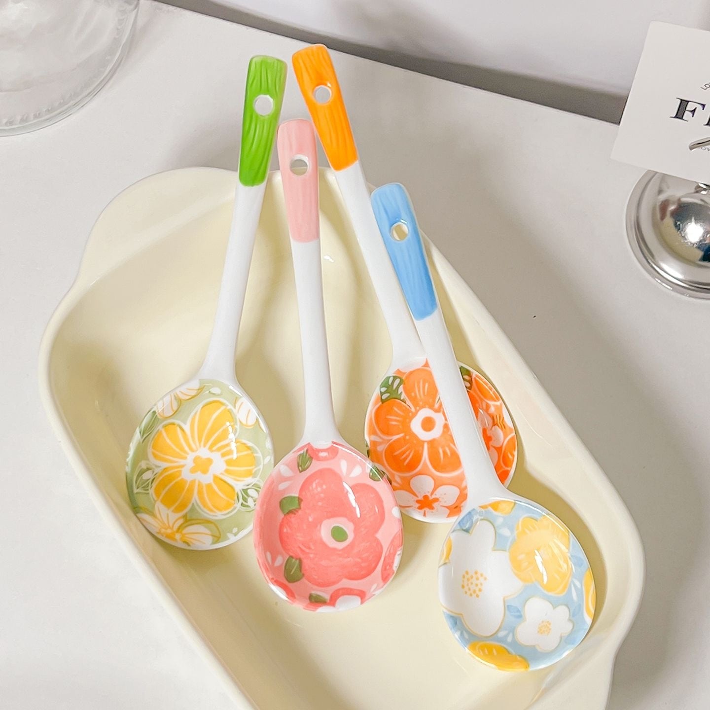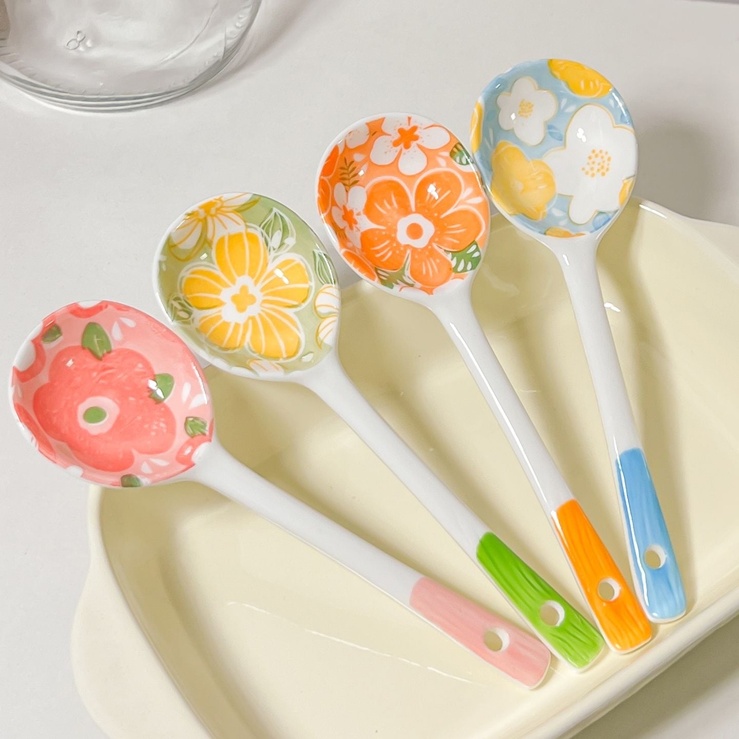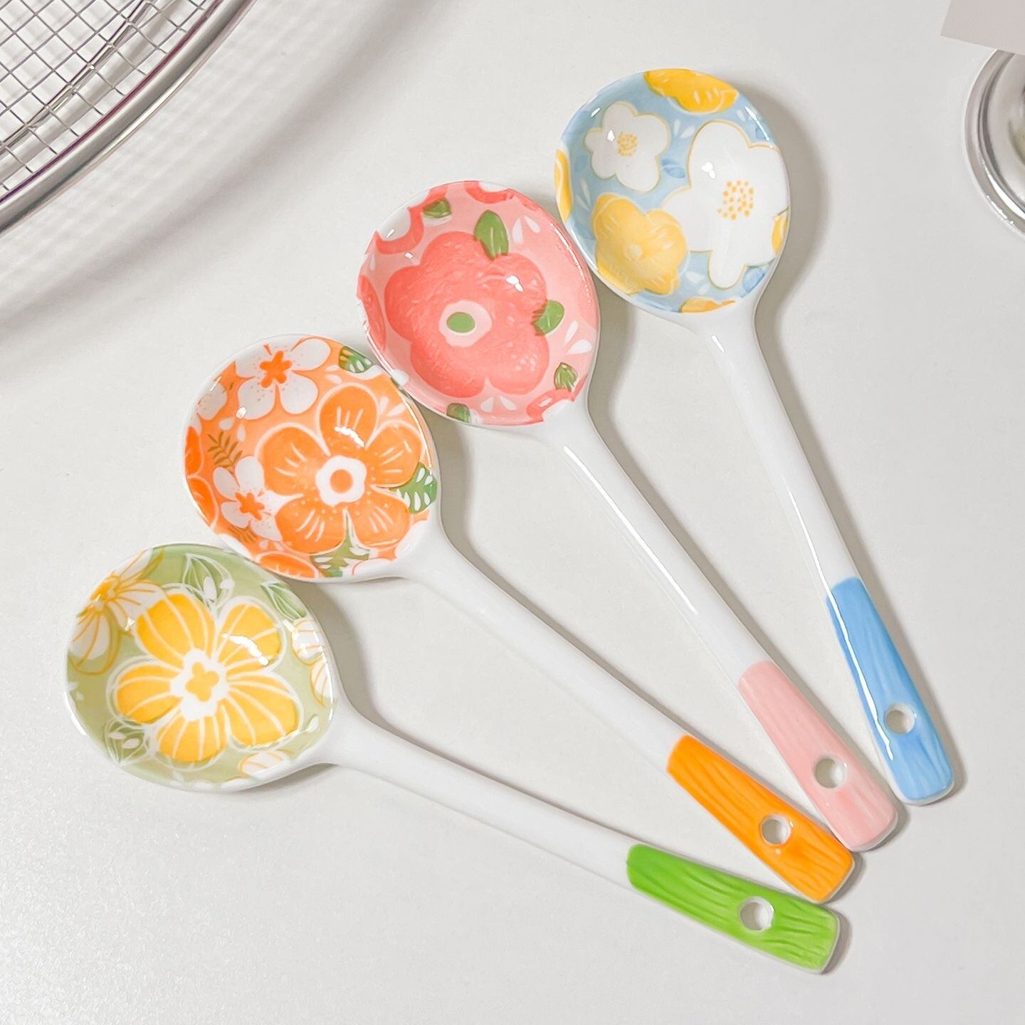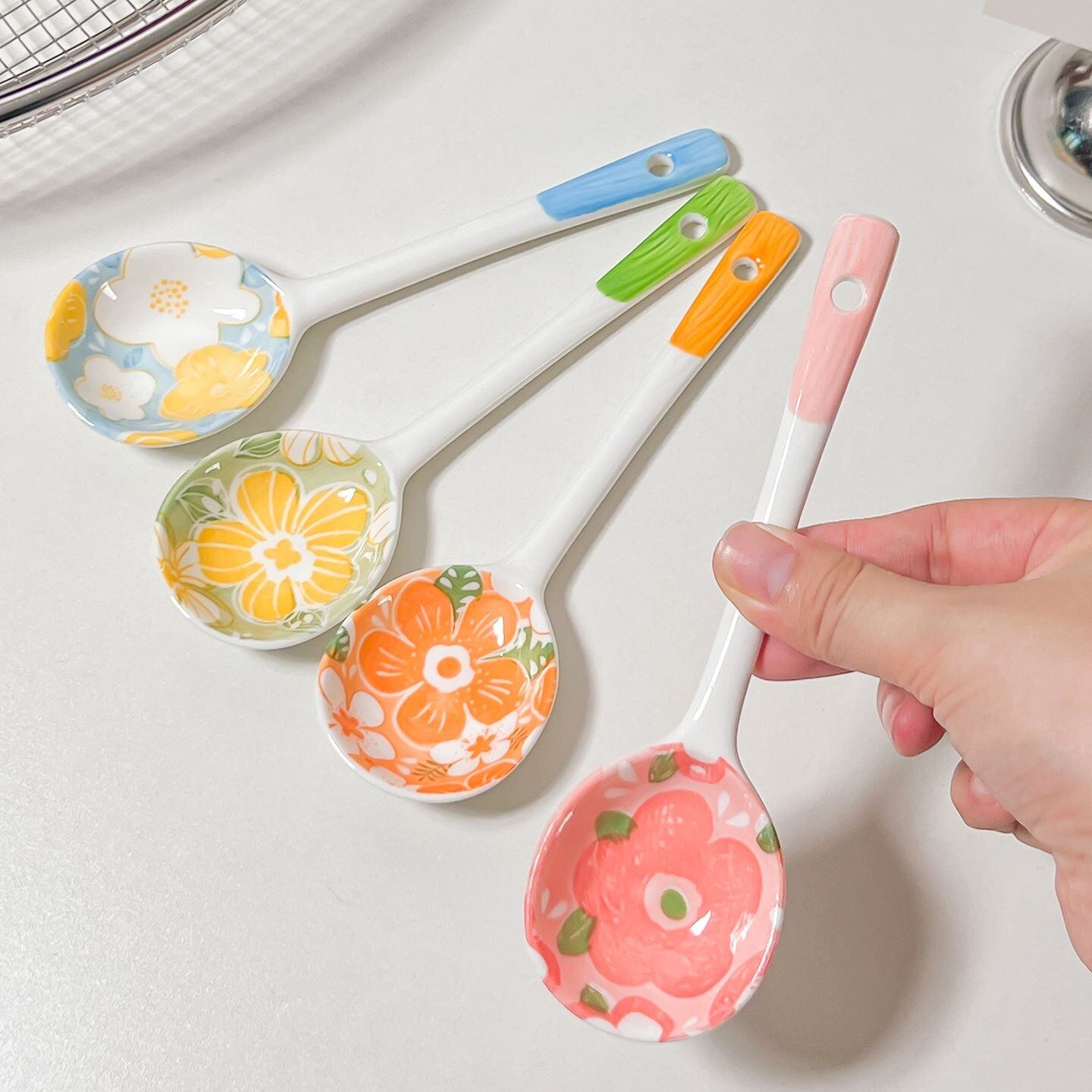 ◎カラフルな磁器スプーン、高温で焼成され、釉下彩で花柄を施し、繊細な質感、使い心地良い。