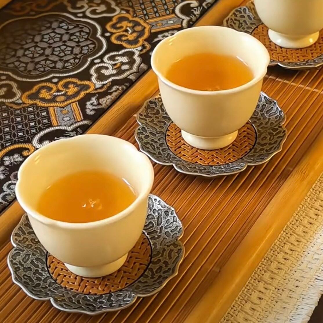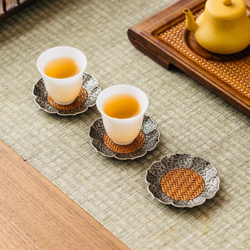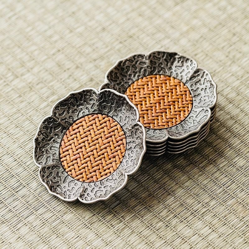 ◎金属と藤の組み合わせで作られた花形の茶托、2色ブラウンの色合いが美しい。木目の美しさを活かし、温かみがあり、いろんな湯呑みと調和でき、使い心地良い。