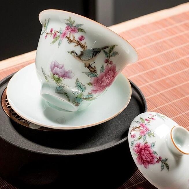 【名称】 粉彩影青 花鳥画蓋碗セット